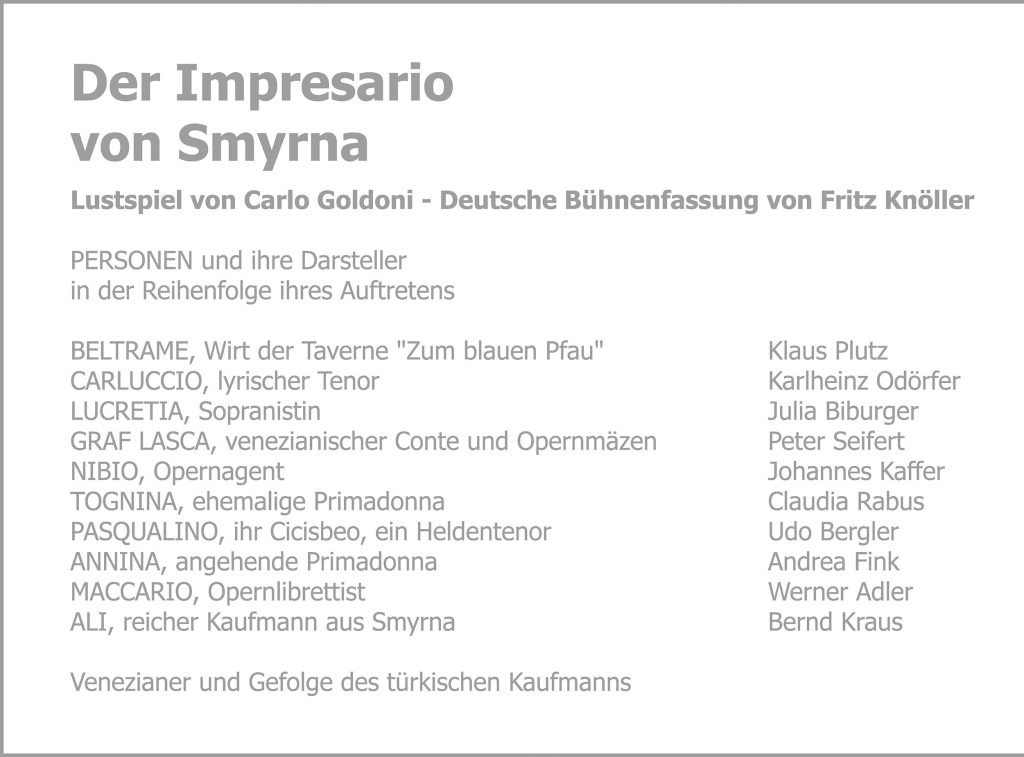In der Taverne „Zum blauen Pfau“, dem Treffpunkt einer Gruppe von „Möchte-gern-Stars“ der venezianischen Theater- und Opernszene kursiert plötzlich das Gerücht, dass ein reicher Türke aus Smyrna, der Handel mit Kümmel und Zimt treibt, sein Schiff im Hafen von Venedig vor Anker gelegt hat und für seine Heimatstadt ein Opern-Ensemble mit italienischen Künstlern zusammenstellen möchte.