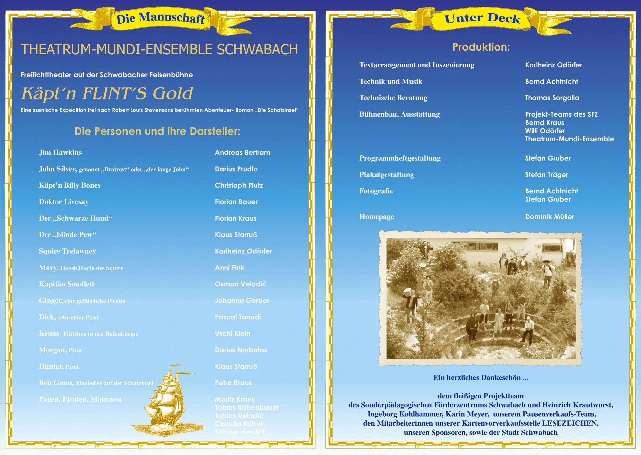 Mit einem Hauch Karibik fügte sich das Ensemble in den Veranstaltungskanon „500 Jahre Schwabacher Blattgold“ mit ein und es gelang, den Bogen bis in die fiktionale Weltliteratur hinein zu schlagen: denn alles beginnt zunächst wie im berühmten Abenteuerroman von Robert Louis Stevenson. Im „Admiral Benbow“, einer kleinen Kneipe in der Schwarzhügelbucht an der Küste Englands, kreuzen unheimliche Gestalten auf: Zunächst ein trunksüchtiger Seemann mit dem Namen Billy Bones, dessen Seemannskiste ein Geheimnis zu verbergen scheint. Danach ein zwielichtiger Matrose, der „Der Schwarze Hund“ genannt wird und schließlich ein blinder Alter, der Billy Bones den „Schwarzen Fleck“ überbringt.
